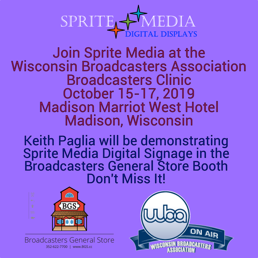 Oct102019NewsKeith Paglia will be demonstrating the array of Sprite Media Digital Signage Category: NewsOctober 10, 2019 Share This Article Share on FacebookShare on Facebook Share on XShare on X Pin itShare on Pinterest Share on LinkedInShare on LinkedIn Post navigationPreviousPrevious post:Sprite Media introduces the new Municipal DisplayNextNext post:Happy Thanksgiving from Sprite MediaRelated PostsSprite Media’s CTO Jeff Schick to Moderate NAB NY PresentationOctober 25, 2023Sprite Media’s Presenter featured in Radio Worlds Spring PreviewApril 3, 2023Sprite Media talks Society of Broadcast Engineers on “This Week in Radio Tech”March 29, 2023See Sprite Media at the Wisconsin Broadcasters ShowOctober 11, 2022Sprite Media’s Broadcast Clock on the Next Best Thing Media TourSeptember 22, 2022Sprite Media’s new Dashboard Express featured in the May edition of Radio World MagazineJune 2, 2022