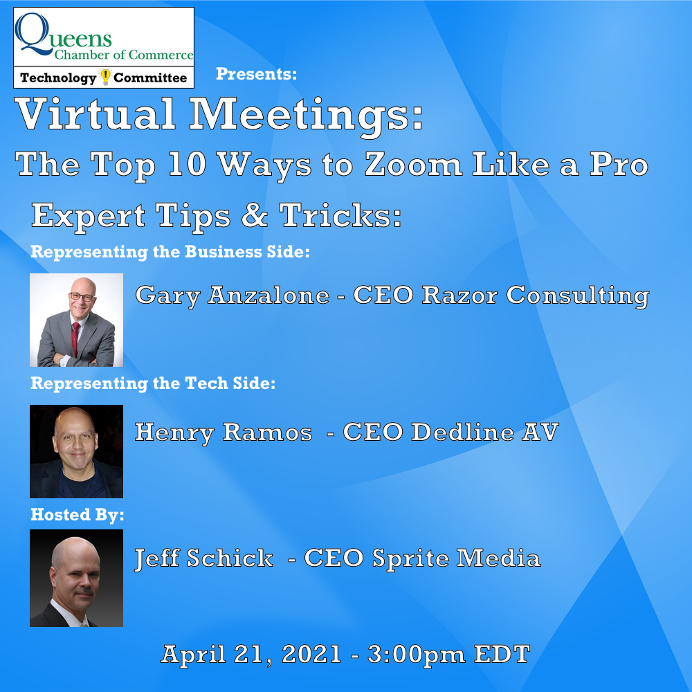 Register for our FREE fun and informative webinar https://queenschamber.glueup.com/event/technology-committee-presents-virtual-meetings-30789 Thursday 4/21/21 at 3pm.