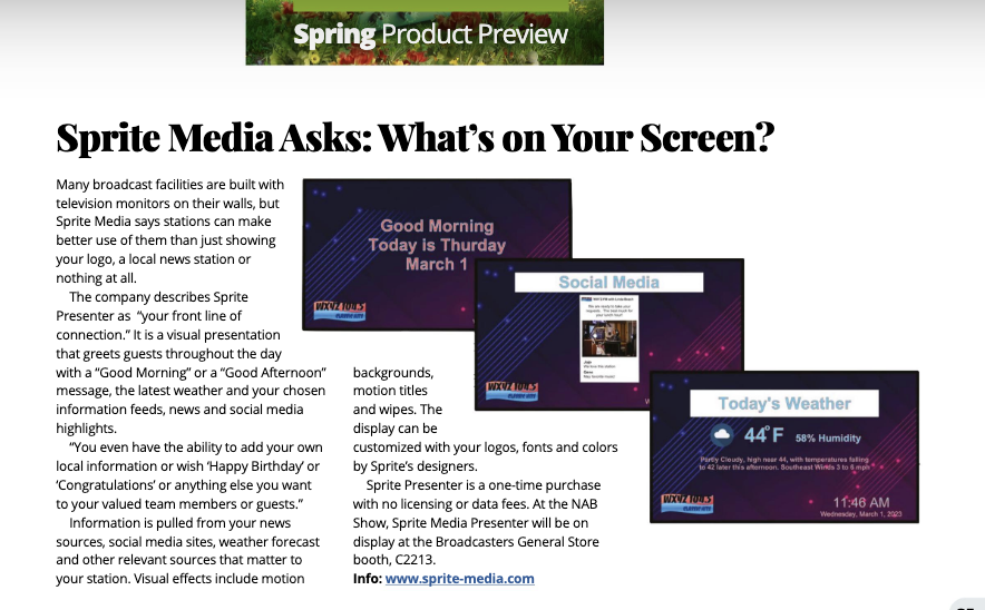 What’s on your screen? Check out “Sprite Media’s Presenter” featured in Radio World’s Spring Product Preview Issue https://www.radioworld.com/resource-center/ebooks/spring-product-preview-2023 We’ll be featuring this new product at the NAB Convention in Las Vegas in a couple of weeks!